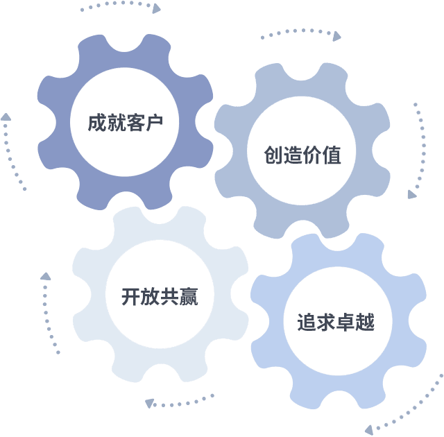 成就客户是一切决策的出发点,,,,创造价值是衡量所有工作的标准,,,追求卓越是我们做事做人的态度,,开放共赢是我们的格局也是最终的结果。。。。价值观的齿轮环环相扣,,,,推动着组织里的每个人不断向前。。。