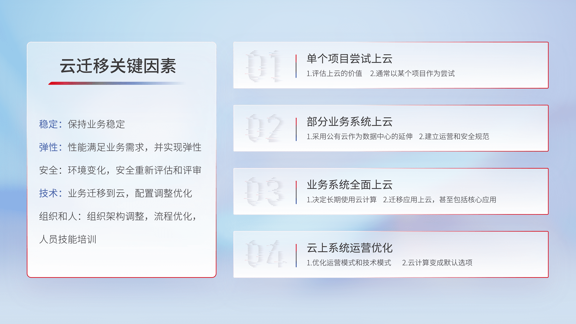 结合实际业务,,,,从规划设计、、、云平台选型、、云原生改造、、、数据迁移、、、、集成交付,,迁移全过程为客户识别最佳上云路径,,做好风险识别管理,,设计网络架构、、身份权限、、安全审计合规、、操作审计、、、日志审计、、、监控告警策略、、、、多站点容灾设计等,,对云上基础设施进行整体规划,,,,提升IT治理水平,,,,以满足弹性、、、高可用、、高性能的需求。。。。