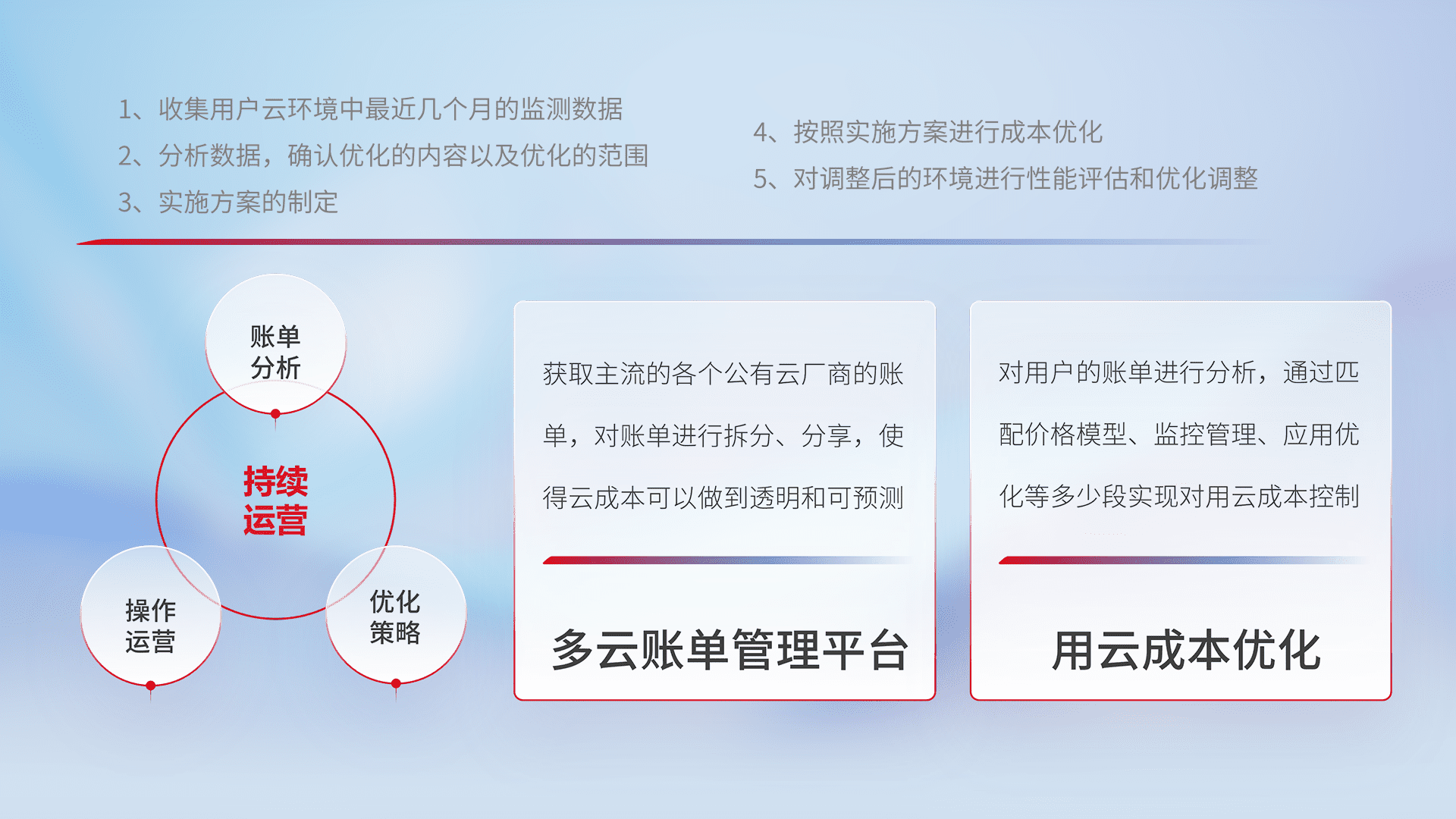 通过多云纳管,,,,以统一的资源数据模型把客户的云资源进行抽象和封装,,,,进而实现对多云资源的统一操作,,,保障云资源管理的可靠性、、、稳定性与可用性。。。量身定制化运维内容,,配置、、、开发运维、、、补丁管理、、备份、、、监控、、认证和访问管理、、、、审计和日常巡检等,,保障在用云过程中的可靠度,,稳定度以及高可用率。。。。